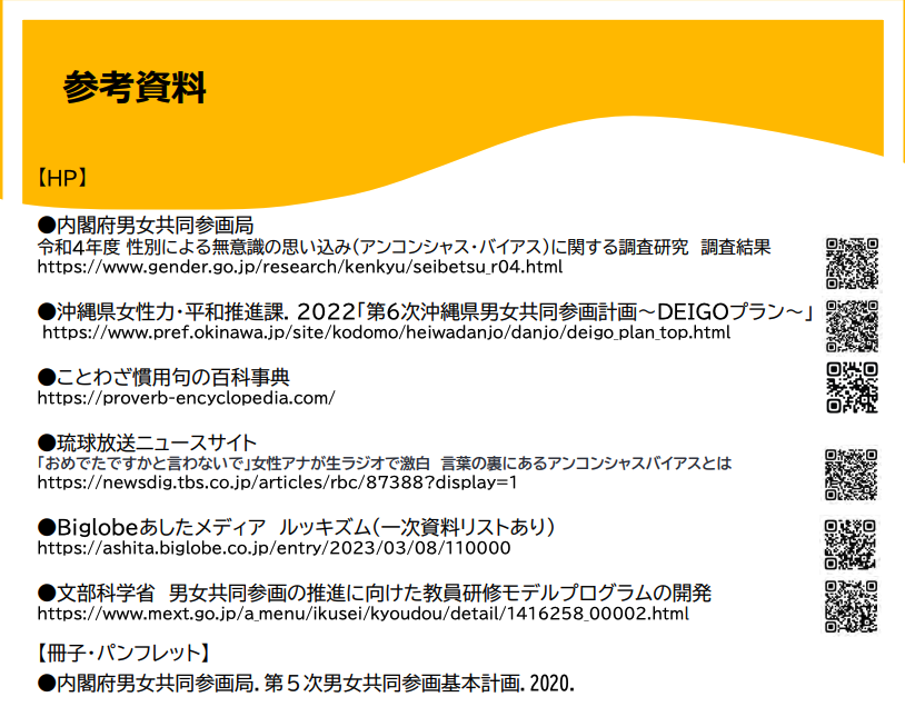 同財団が発行する男女共同参画・ジェンダー平等に関する啓発資料において、性別役割分担意識(「男は~」「女は~」といった固定観念)に関連する言葉やことわざを解説する際の参考文献として、「ことわざ・慣用句の百科事典」(https://proverb-encyclopedia.com/)が活用された。