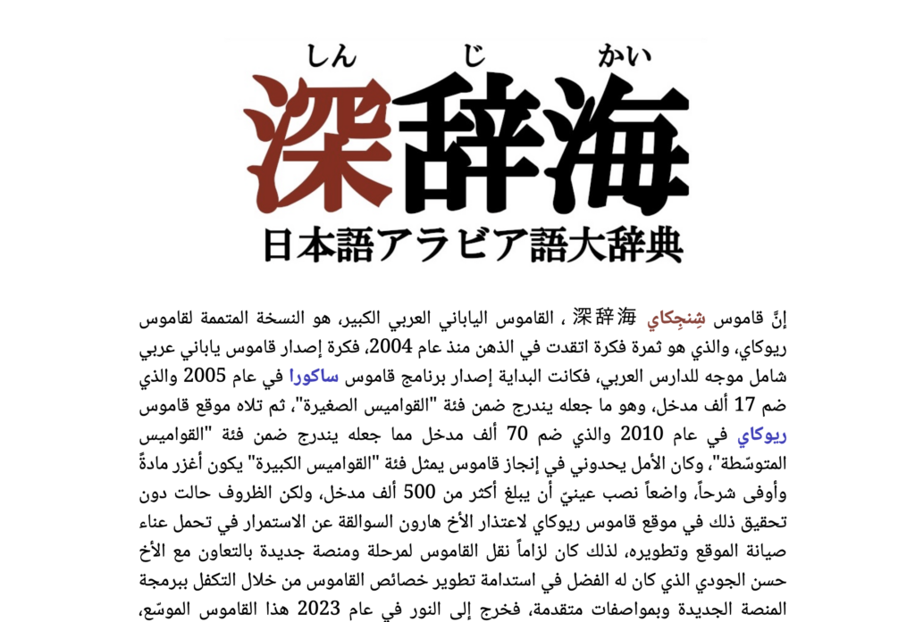 東京大学教養学部報(辞典案内 2025)において「中級以上の学習者には必携」として推奨されているアラビア語日本語大辞典『深辞海』の編纂において、日本語語彙(ことわざ・慣用句・四字熟語)の意味や用例を定義するための参考文献として、当方が運営する『ことわざ・慣用句の百科事典』および『四字熟語の百科事典』の両サイトが採用・記述された。