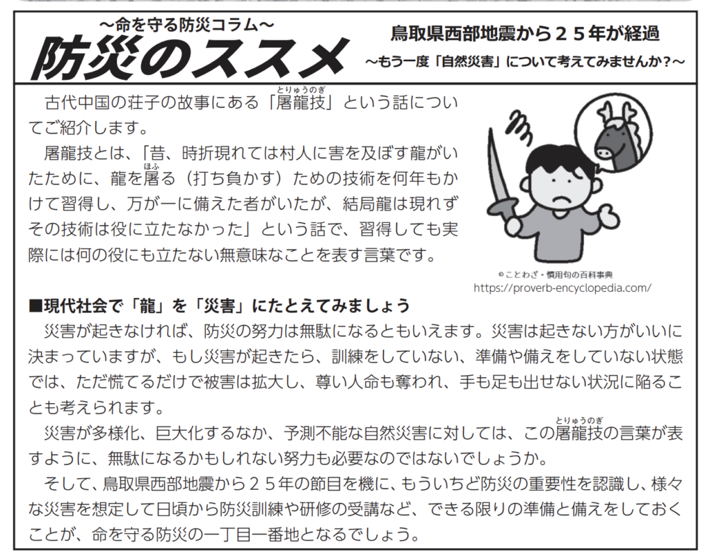 同町が発行する広報誌の防災啓発記事「乗って守ろう!公共交通 ~自然災害について考えてみませんか?~」において、故事成語「屠龍の技」を紹介する際の出典として、「ことわざ・慣用句の百科事典」(proverb-encyclopedia.com)が採用・掲載された。また、「ことわざ・慣用句のイラスト素材」よりイラストを提供した。
